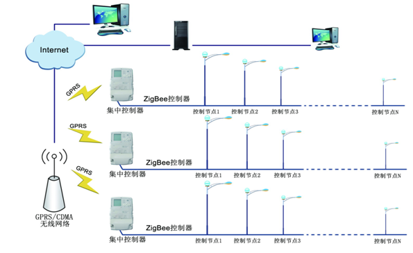 其中道路每個(gè)燈具安裝的單燈控制器采用ZigBee網(wǎng)絡(luò)與集中控制器組成無(wú)線局域網(wǎng),而集中管理器采用GPRS通信方式(或
